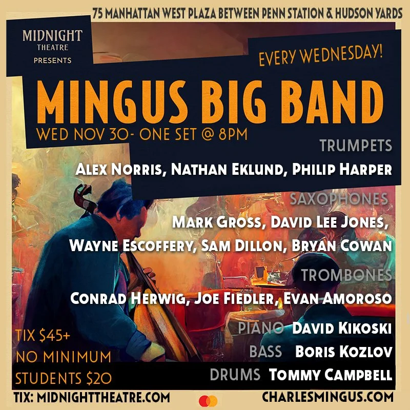 The Mingus Big Band continues its weekly tradition at a new venue: the magical Midnight Theatre