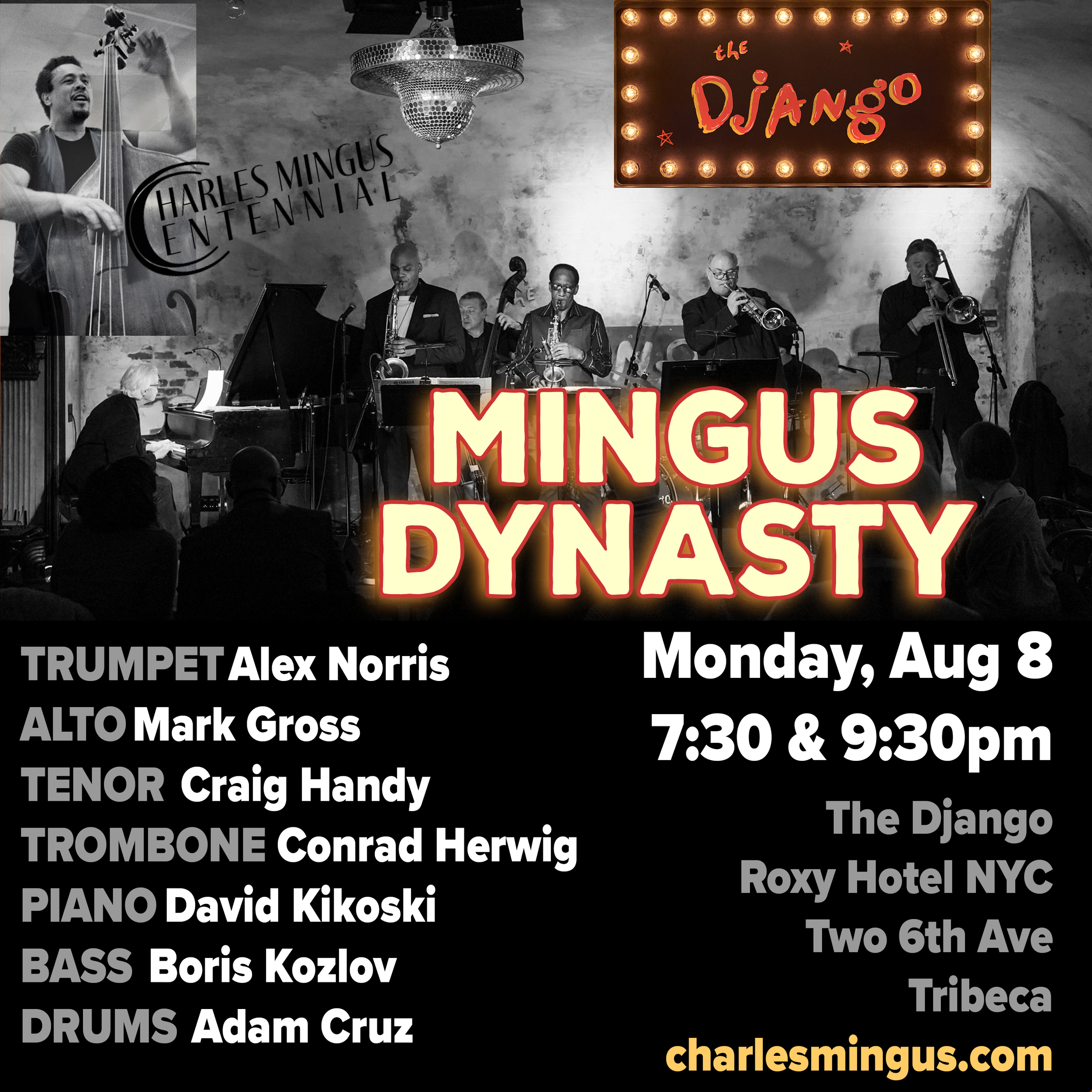 Charles Mingus’ Jazz Workshop revives its weekly celebration! Join us for classic cocktails and dinner at the Roxy Hotel’s downstairs club the Django as we explore the legendary works of the great American composer and celebrate his centennial year. 100 YEARS OF MINGUS!